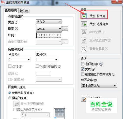 【添加:拾取点】按钮:以拾取点的形式来指定填充区域的边界。单击该按钮切换到绘图窗口,可在需要填充的区域内任意指定一点,系统会自动计算出包围该点的封闭填充边界,同时亮显边界。如果拾取点后系统不能形成封闭的填充边界,则会显示错误提示信息。