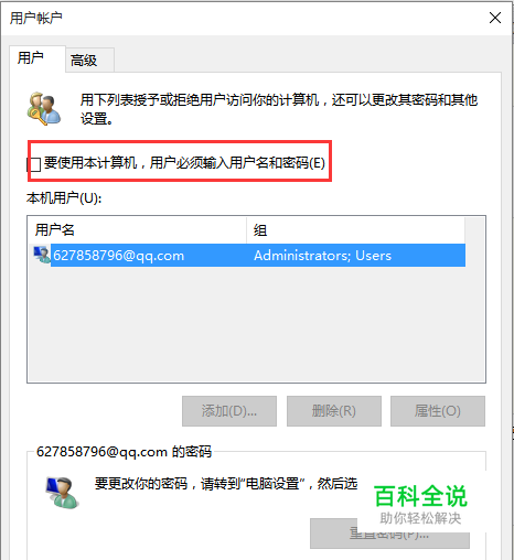 取消勾选要使用本计算机,用户必须输入用户名和密码