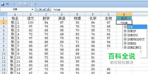 现在我们首先是要sum函数来计算,分别求出每个同学的总分。在H2单元格中输入函数=SUM(B2:G2),然后进行填充,将其余的学生总分计算出来。从计算过程我们可以看出来,sum函数的功能就是能求出单独一行,单独一列或是选中的任意单元格之和,不需要任何条件限制,只是将所选中的单元格内的数字进行相加。