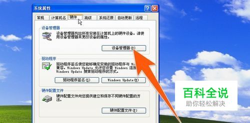在打开的系统属性窗口上,点击"硬件",再点击"设备管理器",如下图箭头所指。