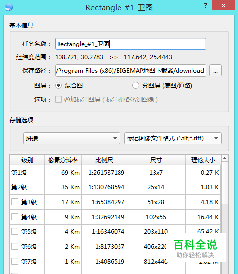 任务名称:下载任务的名称,可重命名 经纬度范围当前下载区域所在的经纬度范围,不可更改 保存路径:下载你选择区域的文件保存的地方,可更改 图层: 图层分为混合图和分层图,混合图就是道路信息和卫星图像混合为一个图层下载下来不能分离;分层图是指:下载下来的卫星图像和道路图层是分开的;如下图所示: