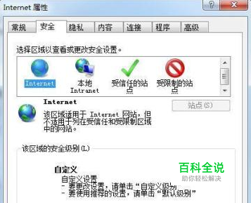 在打开的Internet属性界面中,切换到“安全”选项卡,然后选择“自定义级别”按钮; 推荐:w7系统下载win7zhijia.cn