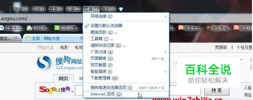首先打开IE浏览器,然后点击菜单栏上方的“工具”选择 “Internet选项”;