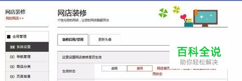 2.页面显示“全局管理、布局管理、模块设置”这三个总项,先来看第一个大项:请点击“全局管理”——“系统设置”此时页面显示“装修启用/禁用、更新头像”。点击“装修启用/禁用”选择“禁用”——点击“保存”(目地在于通知电脑现需要在草稿里完成装修内容,暂不要让消费者看到。)装修设计好后,再点击“启用”,请大家勿忘!