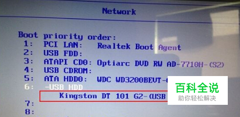 进入“启动项”选择页面后,选择u盘启动(USB HDD/USB/u盘名),并按下回车键确定。