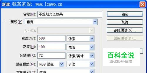 打开软件,Ctrl + N新建一个图层,给图层命名,并将宽度和高度设置为600、400,其它参数如下图。