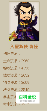 曹操是三国名将历史上一个不可或缺的人物,字孟德,一名吉利,小字阿瞒,沛国谯县(今安徽亳州)人,汉族。东汉末年杰出的政治家、军事家、文学家、书法家[2-3]。三国中曹魏政权的缔造者,以汉天子的名义征讨四方,对内消灭二袁、吕布、刘表、韩遂等割据势力,对外降服南匈奴、乌桓、鲜卑等,统一了中国北方,并实行一系列政策恢复经济生产和社会秩序,奠定了曹魏立国的基础。 三国名将游戏中的曹操: 初始资质: 生命资质:3960、物攻资质:4356、法功资质:2652、物防资质:3609 法防资质:3510、暴击资质:2055、命中资质:1935。 曹操在世时,担任东汉丞相,后为魏王,去世后谥号为武王。其子曹丕称帝后,追尊为武皇帝,庙号太祖。8090三国名将中通过充值的方式,官方可以免费赠送一个曹操哦,机会不可多得~