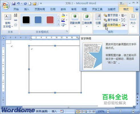 第1步,打开Word2007文档窗口,单击选中文本框。在打开的“格式”功能区的“排列”分组中单击“文字环绕按钮”,如图2009010403所示。图2009010403 单击“文字环绕”按钮