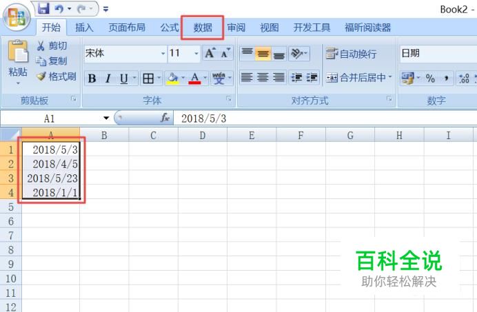 然后我们选中这些日期,之后点击工具栏中的数据;