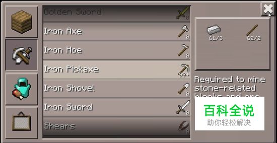 制作铁鹤嘴锄。用制作台来做。用上图的材料列表做鹤嘴锄。