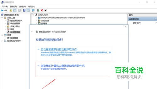 以我的电脑生物识别驱动程序“Synaptic WBDI”为例,鼠标右键点击带有感叹号图标的“Synaptic WBDI-SGX”→“更新驱动程序”→“浏览我的计算机以查找驱动程序软件(R)”→“让我从计算机上的可用驱动程序列表中选取(L)”→“Synaptic WBDI”→“下一步”。