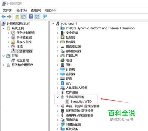 依次打开“此电脑”→“管理”→“设备管理器”→“生物识别设备”。
