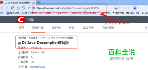 进入你要下载的资源界面,复制资源的下载地址(即网址),例如:我要下载“DJ Java Decomplier破解版”,,我只需要复制“2813197”就可以,如下图所示