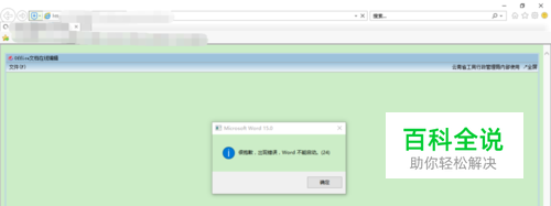 问题重现。用IE浏览器打开“office文档在线编辑”,加载一段时间后弹出弹窗: -------------------------- Microsoft Word 15.0 -------------------------- 很抱歉,出现错误,Word 不能启动。(24) -------------------------- 确定 ---------------------------