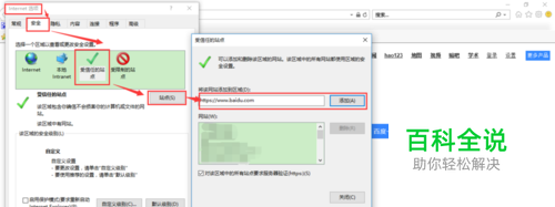 添加受信任的站点。Internet选项设置,安全→受信任的站点→站点→输入站点→点击添加。