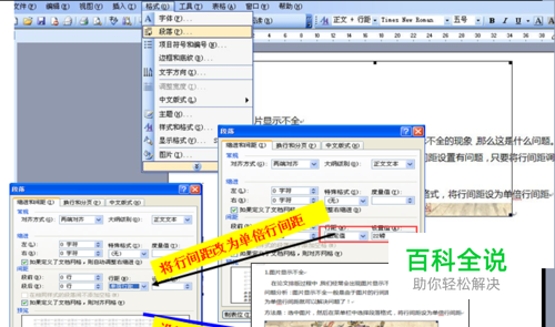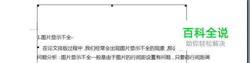 1.图片显示不全 在论文排版过程中,我们经常会出现图片显示不全的现象,那么这是什么问题。问题分析:图片显示不全一般是由于图片的行间距设置有问题,只要将行间距调为单倍行间距就可以解决问题了! 解决方法:选中图片,然后在菜单栏中选择段落格式,将行间距设为单倍行间距