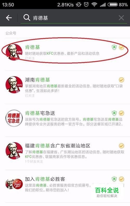 查找公众号,关键字“肯德基”,查找出来后,点击肯德基公众号进入