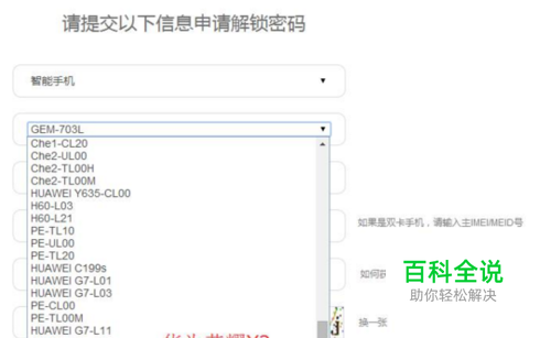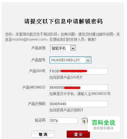 首先我们进入华为手机解锁码申请网站,选择好机型,填写上需要的数据,输入验证码,提交后复制保存解锁码。如图: