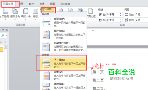 首先打开word文档,把光标放在第二页的开头,点击【页面布局】-【分隔符】-【分节符】-【下一页】