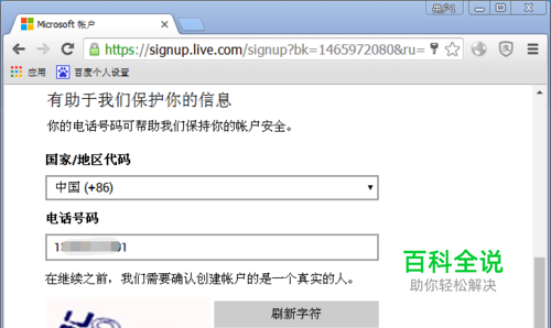 接下来填入一个电话号码以及输入图片中验证码,电话号码没有的话也可以不需要填写。不过最好填写,这样对自己的Microsoft账号安全有保护作用,还有如果图片中验证码看不清楚的话,可以刷一下换一个。
