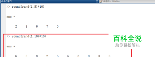 第二步我们输入round(rand(1,5)*10),按回车键就生成了5个0-10的随机整数,如下图所示: