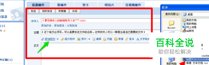 如上图要求,填写收件人邮件主题必须写,点击添加附件,再从弹出的选择框中选取要发送的压缩包文件,文件容量大,等待进度条走完之后,点击下方的确定: