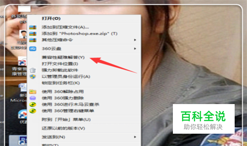 首先,在桌面上找到ps的图标,右键点击出现右拉窗口,点击器菜单上面的 兼容性疑难解答(Y),点击进入。