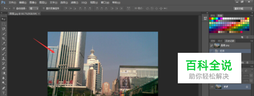 我们可以看到照片中的高楼被拍得倾斜了,下面进行图像的矫正:选择裁剪工具中的“透视裁剪工具”。