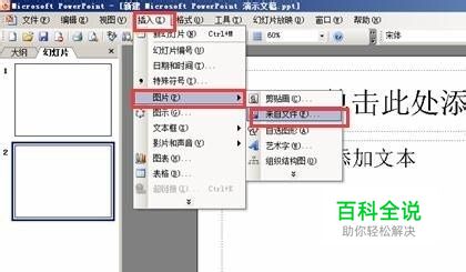 在菜单中单击“插入”——“图片”——“来自文件”。选取图片,点击确定。这样图片插入成功,之后可适当调整图片的大小或位置。