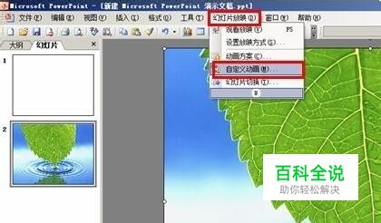 插入图片后,进行自定义动画。在菜单中单击“幻灯片放映”——“自定义动画”,这时右边就会出现自定义动画编辑区域。