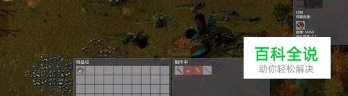 制作好斧头,它会自动装备在身上,在屏幕右下角的装备栏显示。注意工具是有耐久度的,道具下方的绿槽表示耐久度。 走近左边的一片铁矿,屏幕的右上角出现矿藏的说明:采矿名称、采矿难度、费时和总量,用斧头开采4份铁矿,再采一些石块,制作一座石炉。
