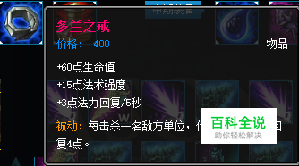 出门装:“多兰之戒” 由于卡萨丁是一位法师,使用技能会比较耗蓝,因此使用一些具有恢复蓝功能的装备是出门必备之选择。