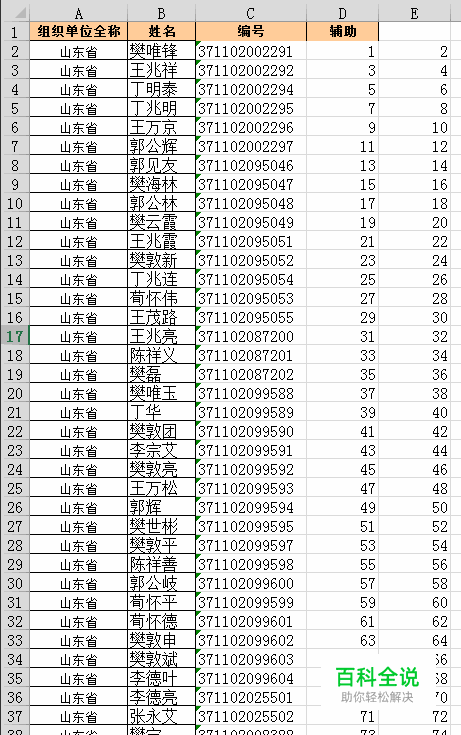 在要处理的Excel数据后面加一个辅助列,可命名为“辅助”。每行后面编序号,填入1、2然后选中双击生成全部序号。 图片中为了便于说明小编隐藏了中间的若干行,下同。