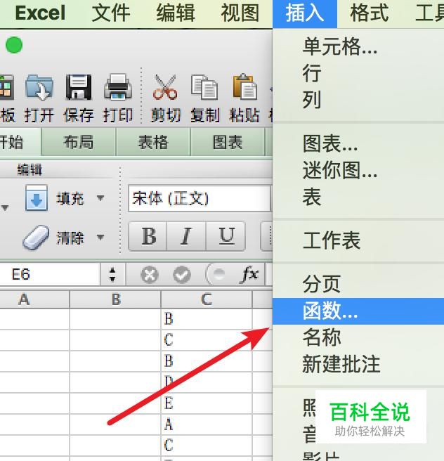 假设我们要从C列的数据里,找出第一个出现字母A的位置,这时我们就可以使用match函数了,这个函数就是查找数据第一次出现的位置的。 点击菜单上的插入,再点击下方的函数。