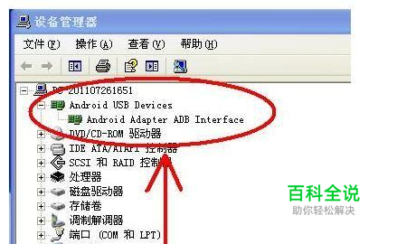 在手机上开启USB调试,并安装驱动 (右键点 我的电脑-属性-设备管理器,查看有没有 android adb 驱动,一般连接过豌豆荚都有驱动了,没有的话可以自行安装,或者连接一次豌豆荚自动下载 (1) 在手机上选择“设置”,然后进入“开发人员选项”,勾选“USB调试” (2) 连接USB数据线 (3) 安装驱动,并检查驱动是否安装