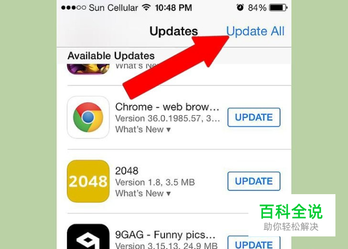 点击右上方的“全部更新”。 或者如果你想更新个别软件的话,可以逐个点击更新按钮。