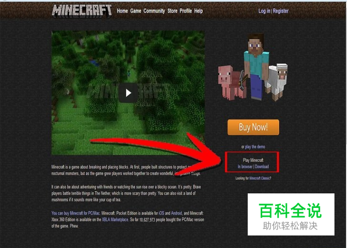在屏幕右侧的 "Play Minecraft"(玩Minecraft)下看到两个链接,一个叫 "In browser" (在浏览器中玩),一个叫 "Download"(下载玩)。点击后者。