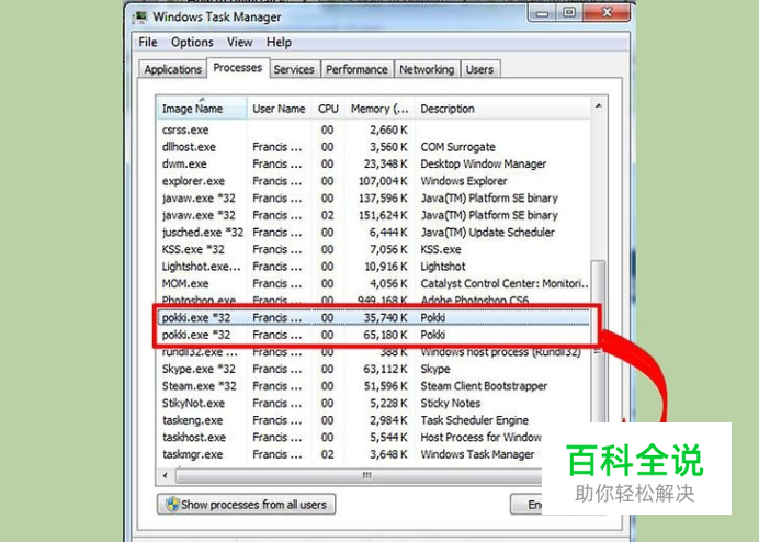 为了顺利地卸载Pokki软件,你需要先打开任务管理器,选择两个名为“Pokki.exe *32”的后台进程,然后点击“结束进程”按钮来终止进程的运行。