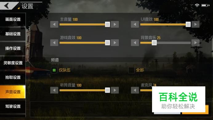 然后在声音设置上面的是主音量,UI音效、游戏音效、背景音乐这几个设置,一般前面的全拉满,背景音乐减到最低,这样就能听清楚游戏音效了。