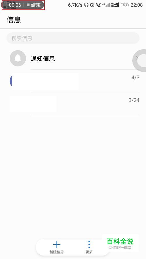 当然这儿还有一个小技巧就是用两根手指轻轻的敲击屏幕也会自动进行录屏哦。当出现图框在的计时标志,就说录屏成功啦。最后点击旁边的结束按钮,就可以结束录屏了。