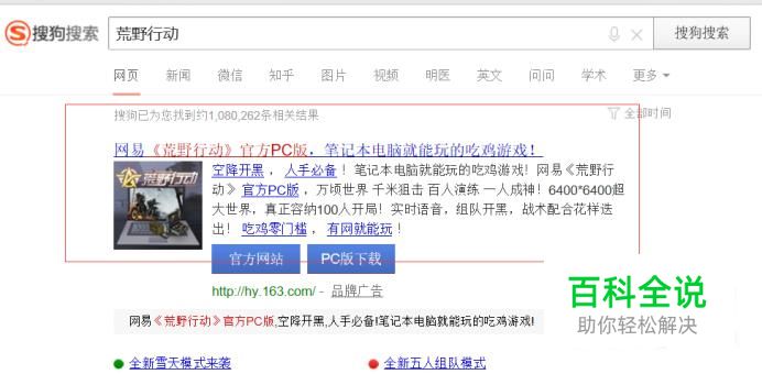 搜狗浏览器搜索“荒野行动”,选择荒野行动官网,鼠标左键单击。