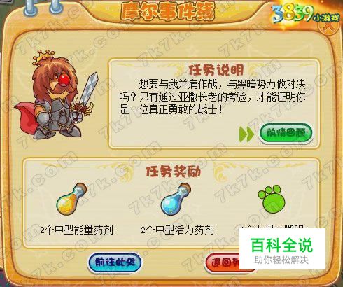 想和摩尔国一一起并肩作战,与黑暗势力做对决吗?只要通过亚撒长老的考验,才能证明自己是一位真正勇敢的战士。完成摩尔庄园战争四起的摩尔王国攻略,奖励大家2个中型能量药剂,2个中型活力药剂和1个七月小脚印。