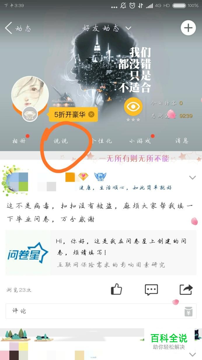 打开你的QQ空间,然后选择“说说”,如下图所示