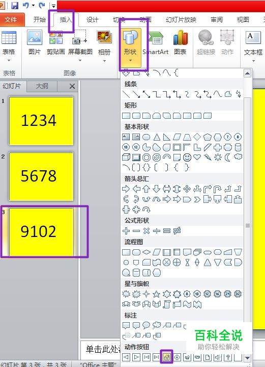 我们选中第三张幻灯片,点击插入,点击形状,点击动作按钮中的第五个按钮;