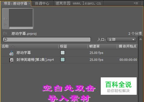 字幕制作完成之后把文字编辑窗口关闭,回到了软件的操作界面啦,在项目面板处就能看到游动字幕了,再用鼠标把游动字幕拖拽到视频2轨道上。按下空格键就可以在预览窗口看到字幕是从左边向右边游动啦。就这样,简单的一行游动字幕就制作完成啦。