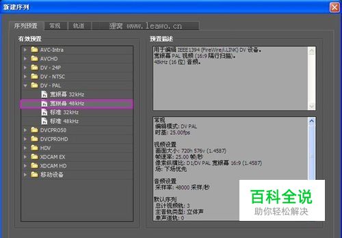 打开软件,点击新建项目按钮,然后在弹出的窗口给文件命名字,选择文件储存的位置点击确定。进入到新建工程的窗口,选择工程预设,选择DV-PAL宽银幕48KHz,在右边可以看到先关的参数。序列命名,确定。
