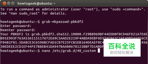 这一步在技术上是可选的 - 我们可以在Grub的配置文件中以纯文本格式输入我们的密码,但这个命令会混淆它并提供额外的安全性。 2、设置密码 键入sudo nano /etc/grub.d/40_custom以在Nano文本编辑器中打开40_custom文件。这是您应该放置自己的自定义设置的地方。如果您将其添加到其他位置,则可能会被较新版本的Grub覆盖。