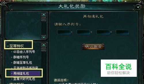 2、在弹出的菜单中,选择“至尊特权”-“再相逢礼包”,复制并激活序列号,领取奖励(点击图片放大查看)