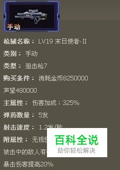 枪魂末日使者-II枪械属性解析 枪械名称: LV19 末日使者-Ⅱ 类别: 手动 类型: 狙击枪7 购买条件: 消耗金币8250000 声望480000 主属性: 伤害加成:325% 弹药数量: 5发 射击速度: 1.2发/秒 附属性: 无视怪物障碍 被击中的敌人有概率受到流血效果影响 暴击伤害提高20%