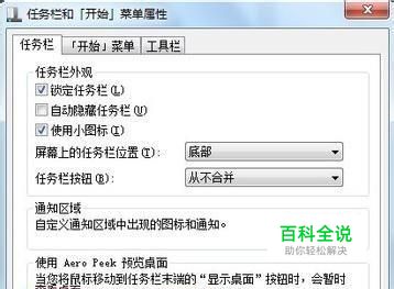 如果电脑中的Win7版本是包含Aero特效的,那也有可能是没有开启该功能。用鼠标右键点击开始按钮,选择属性,在“任务栏和开始菜单属性”中切换到“任务栏”选项卡,查看最下方的“使用Aero Peek预览桌面”是否被勾选,如果没有,则将该项选中,然后点击“确定”按钮保存设置。